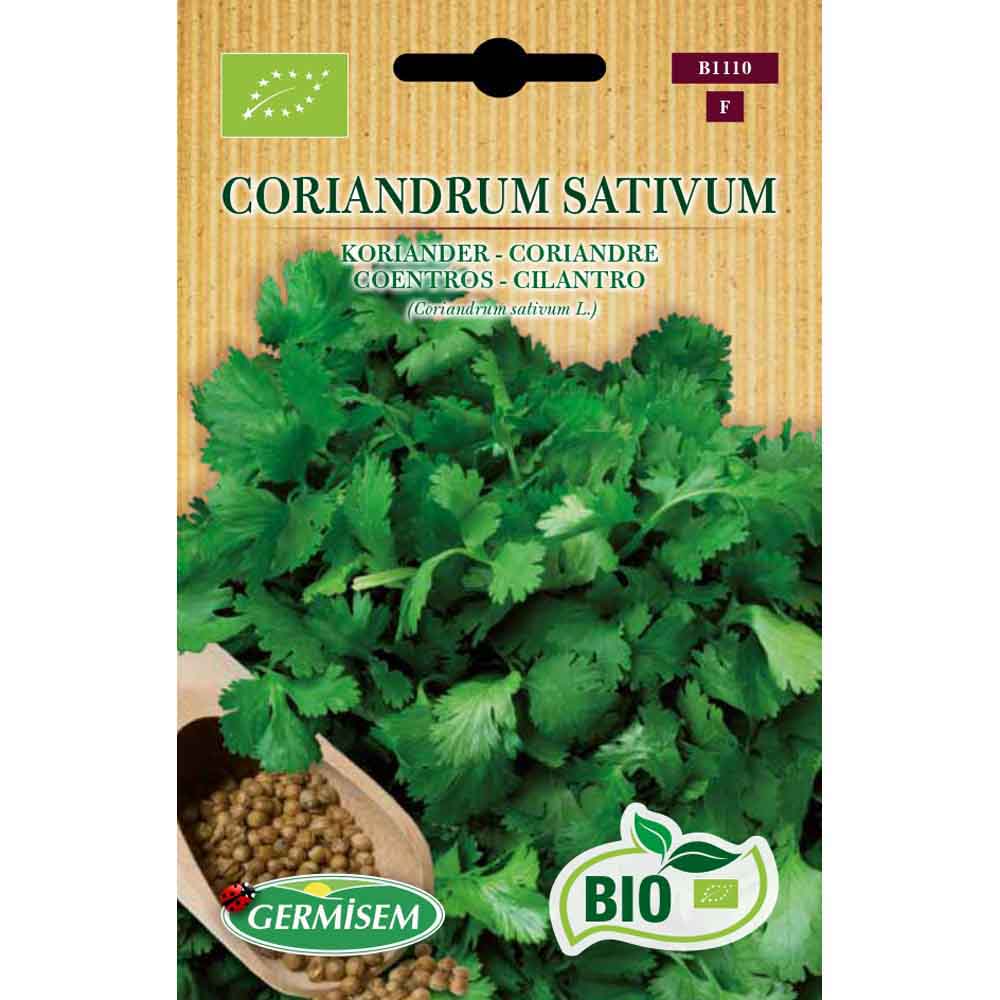 Annuel. Convient pour la culture en pot. Les feuilles fraîchement coupées s'utilisent dans des salades et dans les plats orientaux. La plante forme des ombelles portant de petites fleurs blanches. Pour obtenir des graines de coriandre, à la fin de l'été coupez les ombelles et laissez-les sécher. Culture facile: semez dans un endroit ensoleillé et éclaircissez les plantules à 15 cm dans la ligne. Graines issues de l'agriculture biologique.