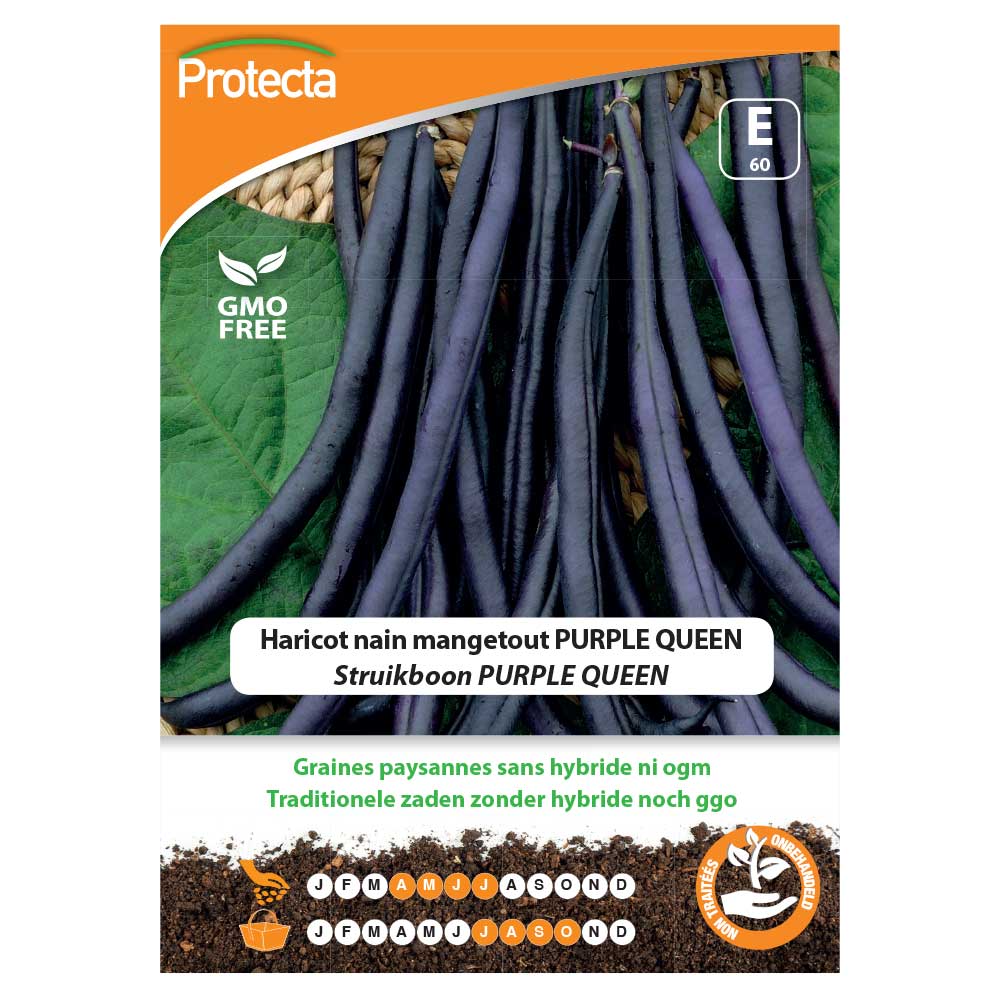 Mettez de la couleur dans votre jardin avec ce haricot à cueillette facile. Les gousses sont longues, sans fil, de couleur violet foncé, tendres et beurrées. Après la cuisson, les gousses sont vertes. Semis:Variété adaptée à la consommation en frais, la conserve et la congélation. Cuire ces haricots mangetout sans excès pour pouvoir les déguster tendres et bien moelleux. Pour que les haricots gardent leur belle couleur verte après cuisson, les jeter dans un grand volume d'eau bouillante et ne pas couvrir la casserole durant la cuisson. Dès la fin de celle-ci, les plonger dans de l'eau glacée - la chlorophylle, pigment vert du légume, se fixe alors sous le choc thermique. Ou d’Avril à Juillet : Récolte:1. Semis en lignes : Ouvrir des sillons de 3 à 5 cm de profondeur, distants de 70 cm. Semer une graine tous les 4-5 cm. 2. Semis en Poquets : Mettre 5-8 graines dans des trous (poquets) espacés de 50 cm en tous sens. Bien humidifier le sol au moment des semis. Renouveler le semis toutes les 3 semaines pour obtenir une production continue. Conseils:De Juillet à Octobre, trois mois environ après le semis. La récolte se fait quand la gousse est bien pleine pour la consommation en grains frais. Pour les grains secs, la récolte sera faite quand la gousse aura séché.