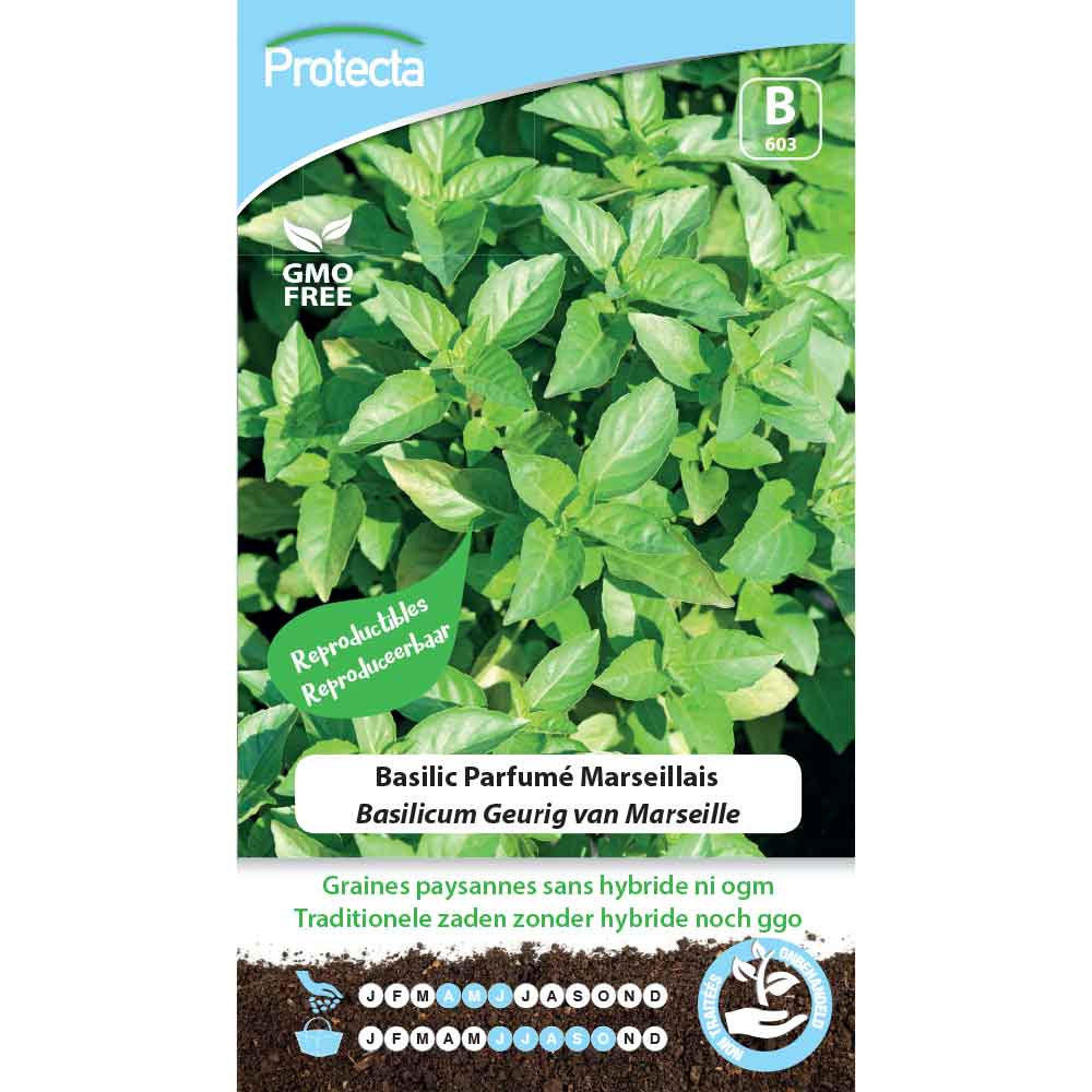 Forme de basilic typique de la région Provençale. Feuilles de taille intermédiaire entre le "grand vert" et le "fin vert" avec une finesse d'arôme incomparable. Semis:d'Avril à Juin, direct en place sur terre réchauffée, avec éclaircissage à 15 cm. Arrosages modérés au pied des plantes. Il faut prévoir une exposition chaude et bien ensoleillée. L'on peut aussi semer en godets à replanter. Se prête bien à la culture en pot. Récolte:de Juin à Octobre. Pincer le haut des branches dès qu'apparaissent les premières fleurs. Conseils:le basilic éloigne les parasites et renforce la saveur de la tomate.