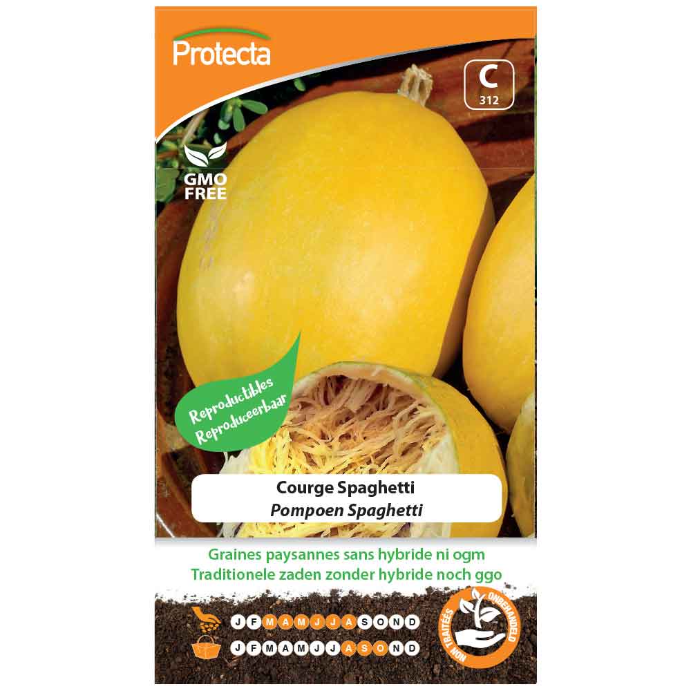La chair jaune clair donne, après préparation au four ou cuisson à la vapeur d’un fruit en entier, des filaments fermes, comme le spaghetti. Les fruits se conservent bien pour la consommation en hiver. Semis:de Mars - Avril en godets ou en terrine pour repiquer ensuite les meilleures plantules en godets. Mettre en place à bonne exposition en Mai, en espaçant les plants de 1 m sur 2 m. La plante est très coureuse et il faut lui prévoir de la place. Ou de Mai à Août direct en pleine terre, dans des trous distants de 1 m sur 2 m. Bien tremper le trou d'abord, et y placer après ressuyage 4 graines. Recouvrir finement de bonne terre. Levée en 6 jours. Ne conserver ensuite que 2 plants. Ne pas tailler cette plante très coureuse. Eventuellement faire grimper sur un support. Récolte:d'Août à Octobre au fur et à mesure de la maturité. En fin de végétation, retourner les fruits pour faire mûrir uniformément. Fin Octobre, mettre tout les fruits à l'abri hors gel pour conserver encore 2 à 3 mois. Conseils:les radis, la menthe et les légumes secs apprécient la compagnie de la courge en éloignant les nuisibles