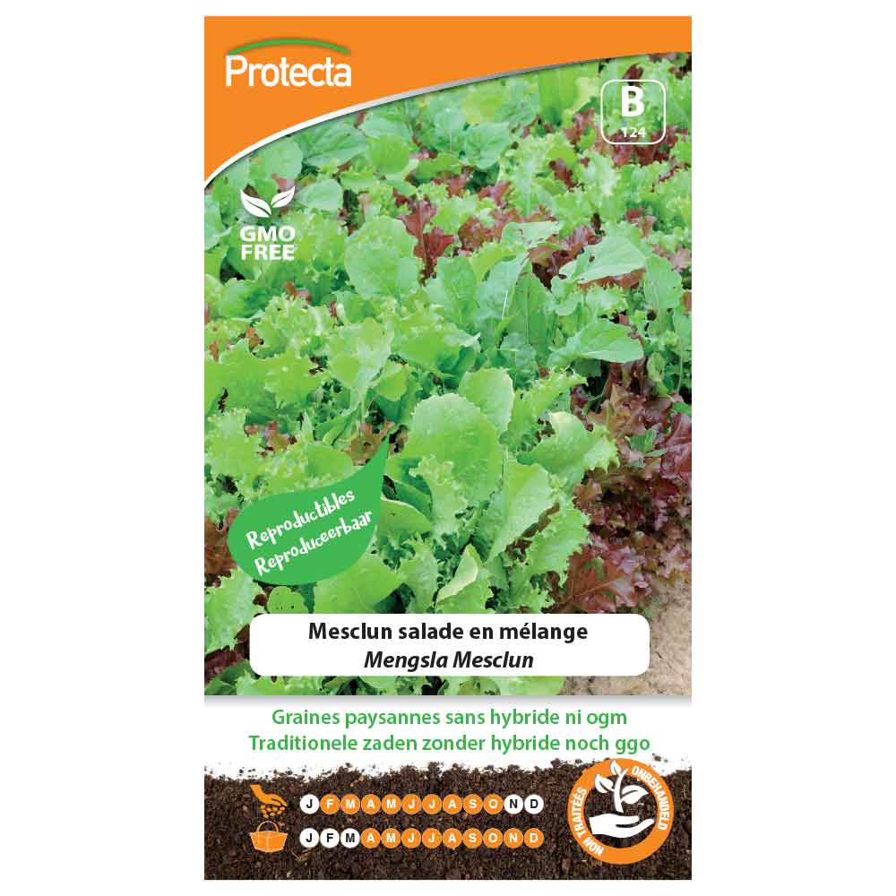 Mélange de 10 espèces de salades riches en couleurs et en saveurs qui composent le véritable MESCLUN NIÇOIS (chicorées frisées, scaroles, sauvages, laitues romaines, à couper, mâche et pissenlit). La roquette et le cresson, trop envahissants, ne sont pas inclus dans le sachet. Semis:de Février à Octobre. Bien mélanger les semences et faire un semis à la volée plutôt épais. Récolte:Avril à Décembre. Dès le stade jeunes plants, couper en mélange au fur et à mesure des besoins tout en éclaircissant. Conseils:le mesclun aime la compagnie des légumes fruits pour une bonne production des uns et des autres.