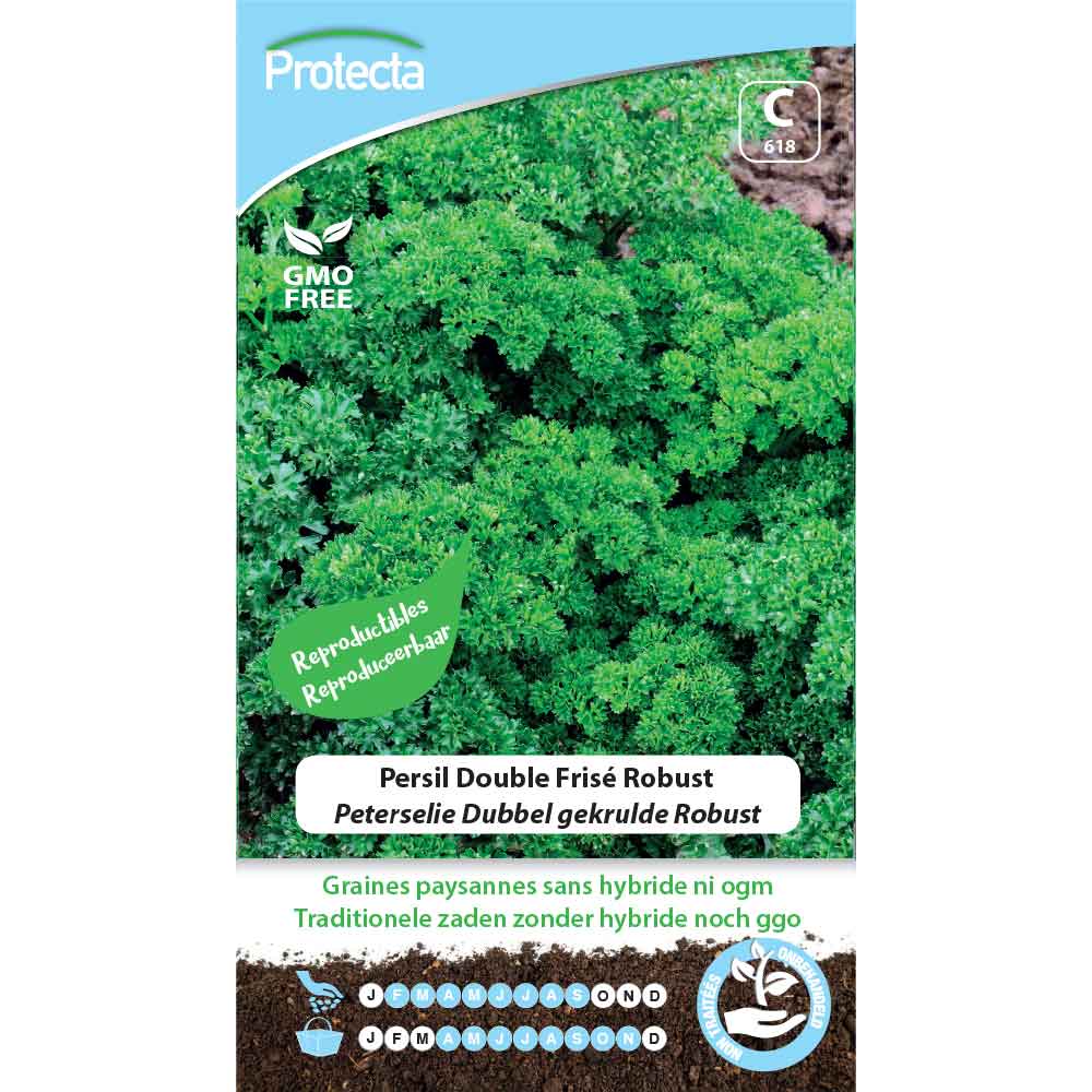 Feuillage frisé vert foncé perlé. Semis:de Février à Septembre, en place, en bordures ou en rayons distants de 25 cm. Tenir les semis humides jusqu'à la levée complète. Les semis tardifs se feront à l'abri pour permettre la récolte pendant l'hiver. Récolte:d'Avril à Automne. Conseils: le persil en bonne compagnie avec le cresson, l'haricot et la tomate.