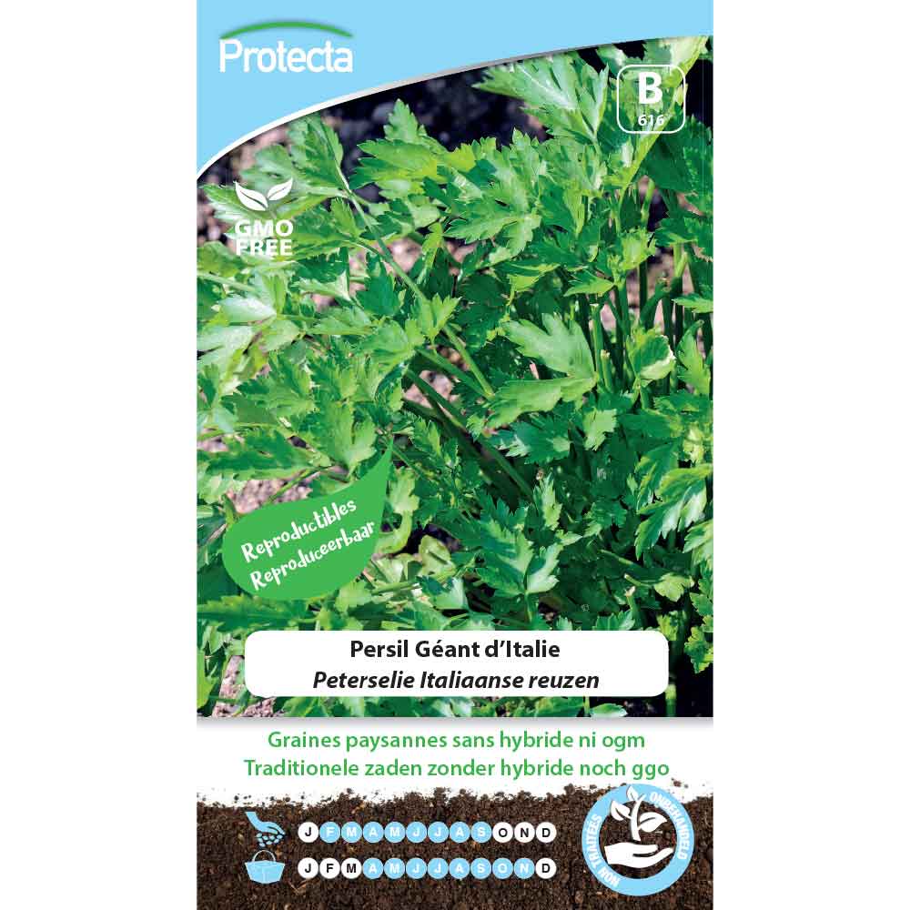 Variété remarquable par son grand feuillage et sa croissance rapide. Le persil monte à graines après un hiver. Pensez à faire de nouveaux semis. Pour faciliter la germination, vous pouvez tremper vos graines pendant une nuit avant le semis. Le persil aime l'exposition mi- ombragée. Semis:de Février à Septembre, en place, en bordures ou en rayons distants de 25 cm. Tenir les semis humides jusqu'à la levée complète (14 à 21 jours). Les semis tardifs se feront à l'abri pour permettre la récolte pendant l'hiver. Récolte:d'Avril à Automne. Conseils: le persil en bonne compagnie avec le cresson, l'haricot et la tomate.