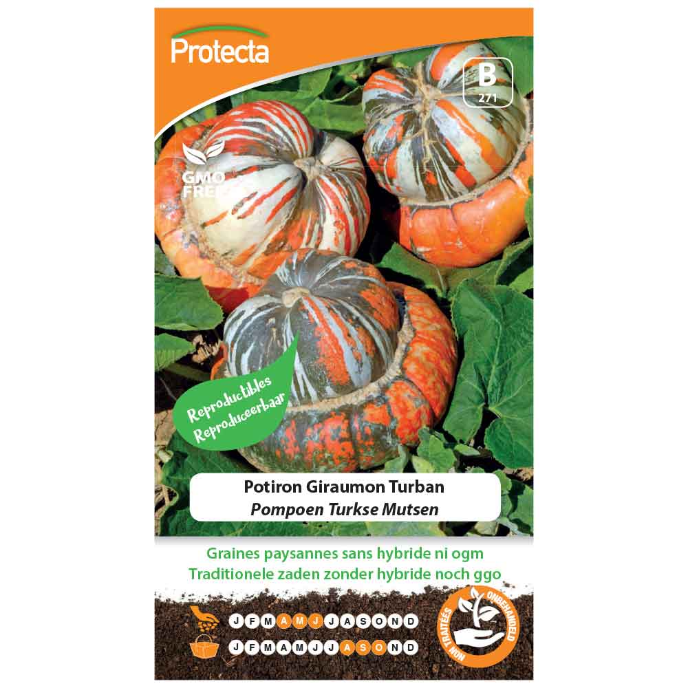 Cette variété vous donnera des fruits aussi curieux que décoratifs par leurs couleurs bariolées et leurs formes originales. Ces potirons, de grosseur moyenne (5 à 6 kg), ont une chair fine, sucrée et à la saveur délicate. Semis:d'Avril à Juin, en place, à bonne exposition, dans des trous distants de 2 mètres en tous sens, placer 4 à 5 graines par poquet, arroser et recouvrir de quelques cm de bonne terre. Ne conserver que 2 plants par trou. Ou Août à Octobre au fur et à mesure de la maturité. En Septembre, retourner les fruits pour faire mûrir uniformément. Fin Octobre, rentrer les fruits et conserver tout l'hiver. Récolte:d'Août à Octobre au fur et à mesure de la maturité. En Septembre, retourner les fruits pour faire mûrir uniformément. Fin Octobre, rentrer les fruits et conserver tout l'hiver. Conseils:le potiron aime la compagnie du radis car il éloigne les insectes et autres pucerons.