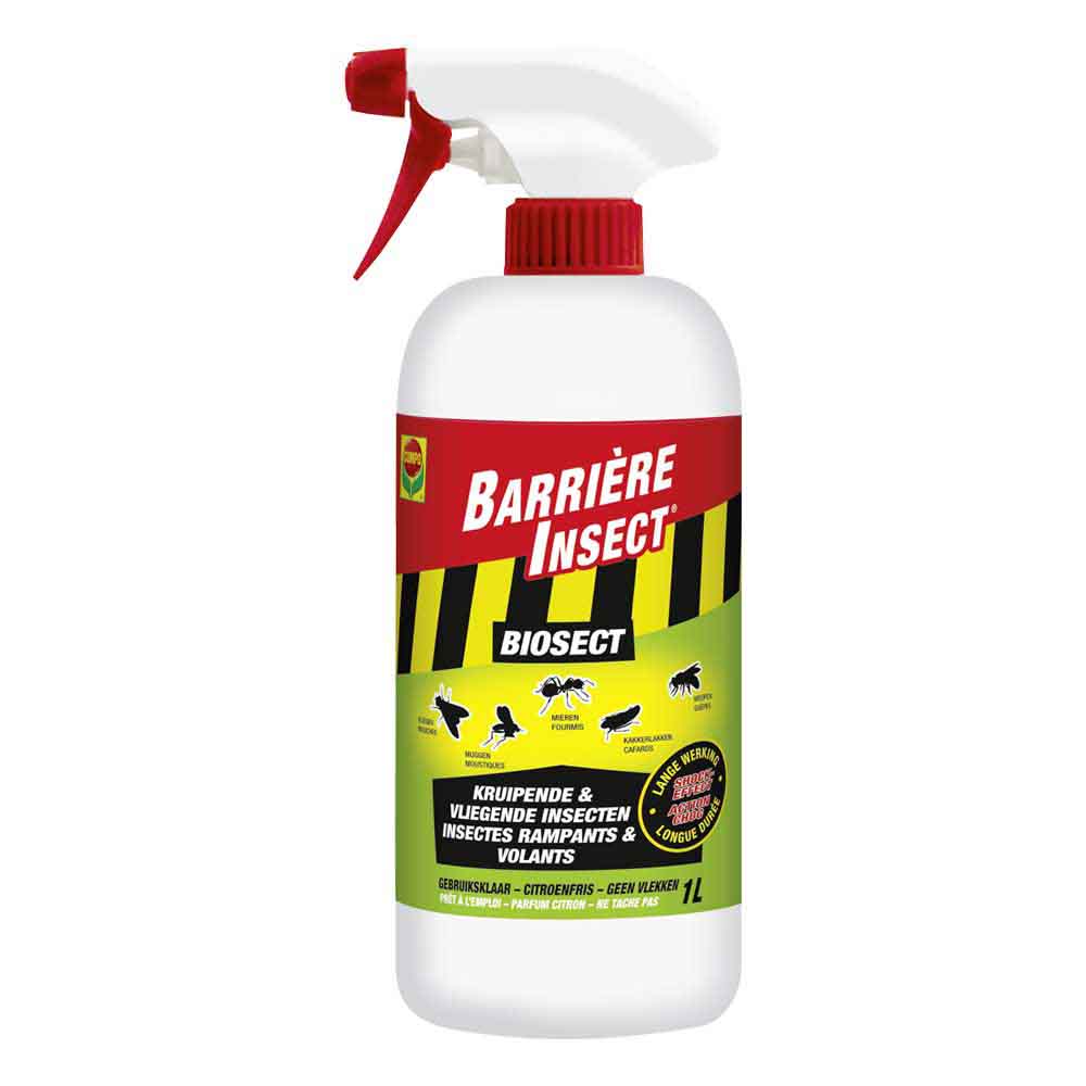 COMPO Barrière Insect Biosect Spray combat vite et pendant une longue période tous les insectes rampants (fourmis, charançons, cloportes, puces, lépismes, grillons, cafards, poissons d'argent, …) et insectes volants (guêpes, mouches, moustiques, teignes, psychodes, ...) dans les maisons, les bâtiments et les lieux de travail. Le produit a une action choc : il agit rapidement sur les insectes, dès qu'ils entrent en contact avec le produit. En plus, il ne fait pas de taches.