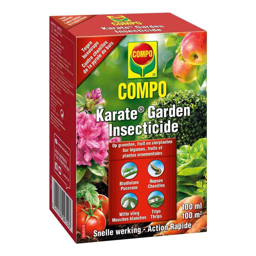 COMPO Karate Garden est un insecticide concentré contre les insectes suceurs et mordants (pucerons, coléoptères, chenilles, mouches de légumes, mouches blanches, ...) sur légumes, fruits et plantes ornementales. Le produit est rapidement absorbé et par conséquent résistant à la pluie en 2 heures. En plus, il a une action de 2 semaines. Pour les légumes et les fruits, le délai d'attente avant la récolte est très court. Le produit est très efficace contre la pyrale du buis.