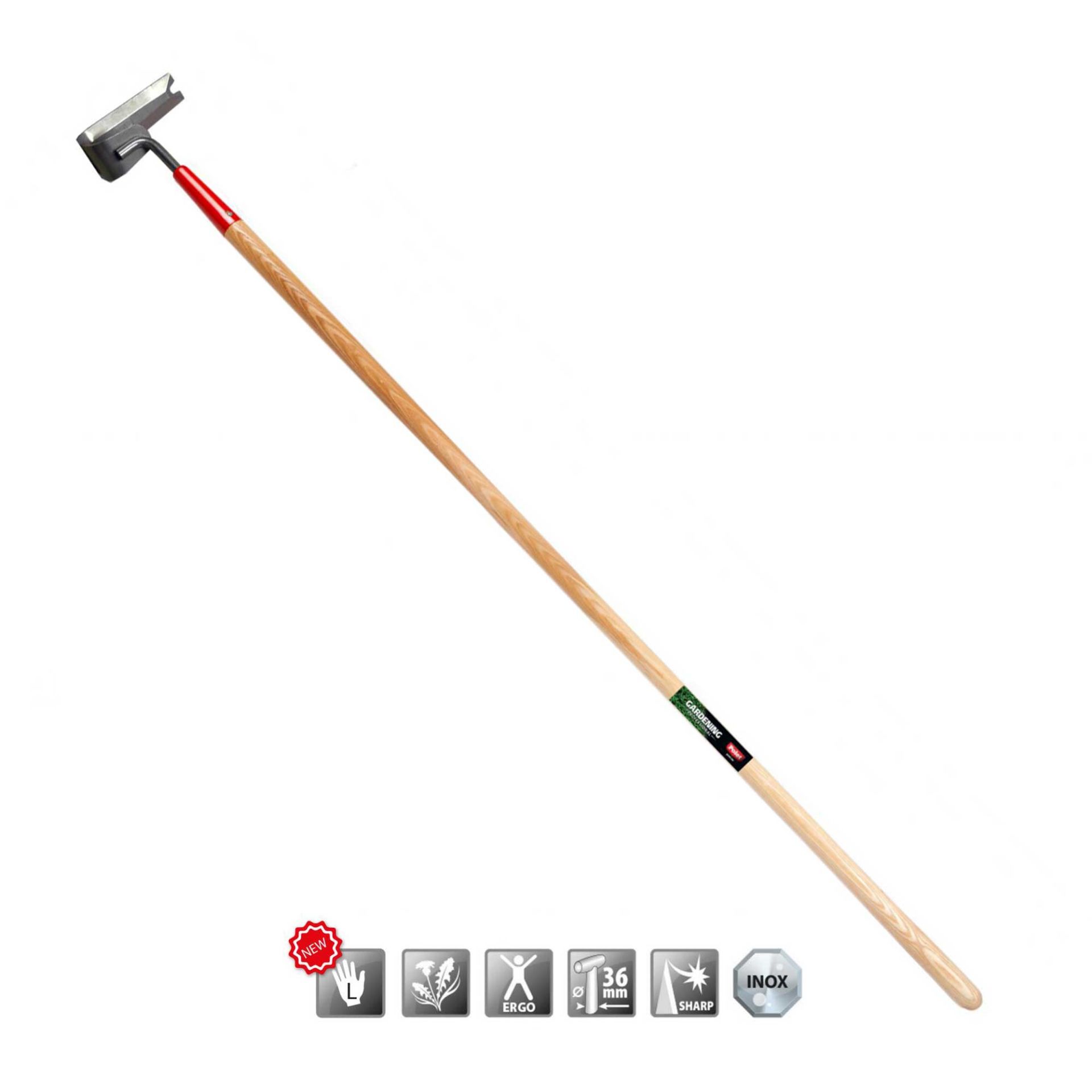 Outil qui permet de désherber en tirant ou en poussant. Utilise toute la largeur de l'outils (14 cm) ou le petit coté pour se faufiller entre les plantes.