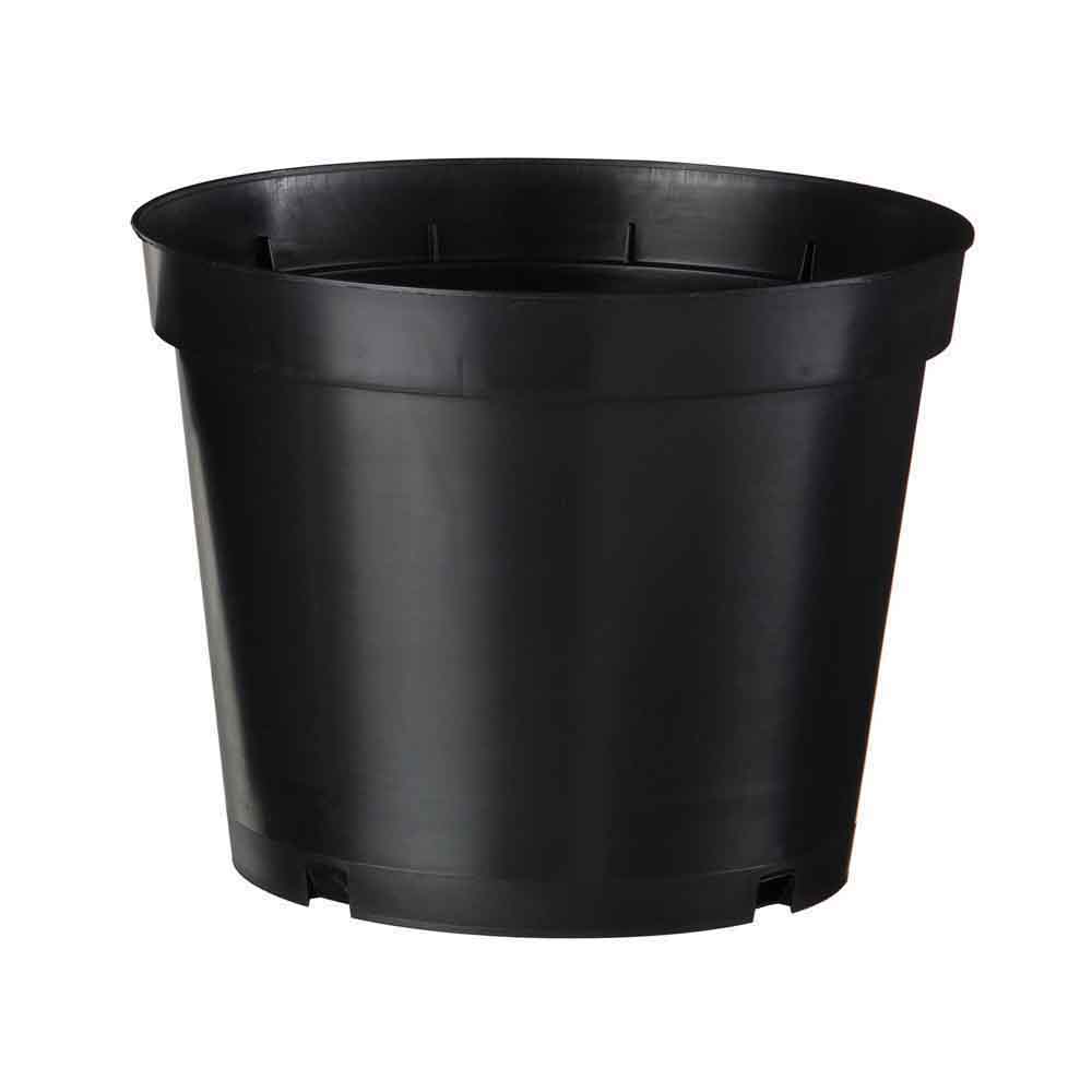 Conteneur en polypropylène de couleur noire. Fond plat avec trous de drainage en contact avec le sol et crevées latérales intérieures.