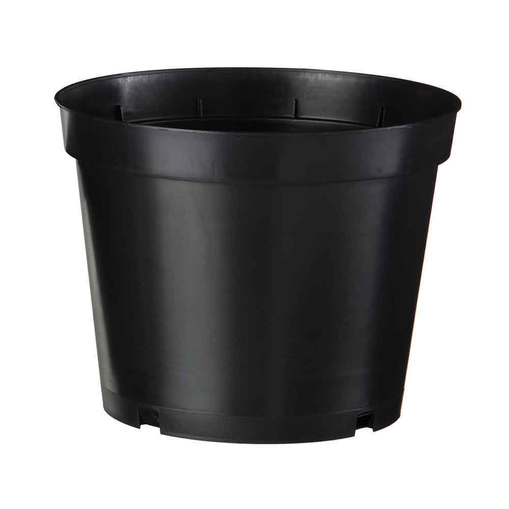 Conteneur en polypropylène de couleur noire. Fond plat avec trous de drainage en contact avec le sol et crevées latérales intérieures.