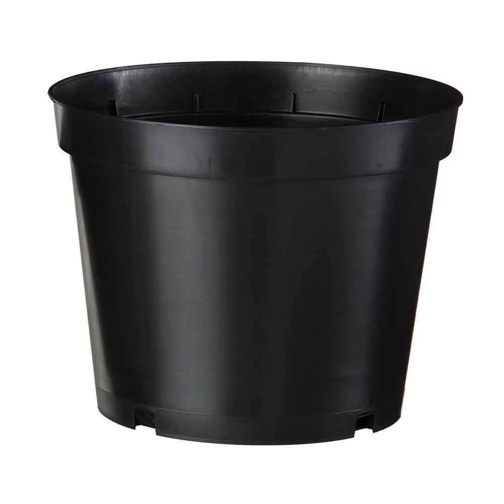Conteneur en polypropylène de couleur noire. Fond plat avec trous de drainage en contact avec le sol et crevées latérales intérieures.
