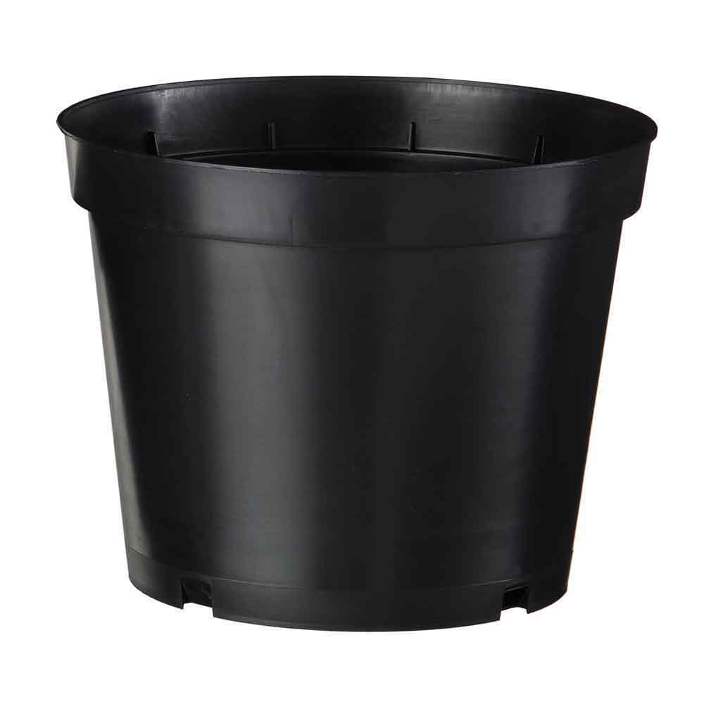 Conteneur en polypropylène de couleur noire. Fond plat avec trous de drainage en contact avec le sol et crevées latérales intérieures.