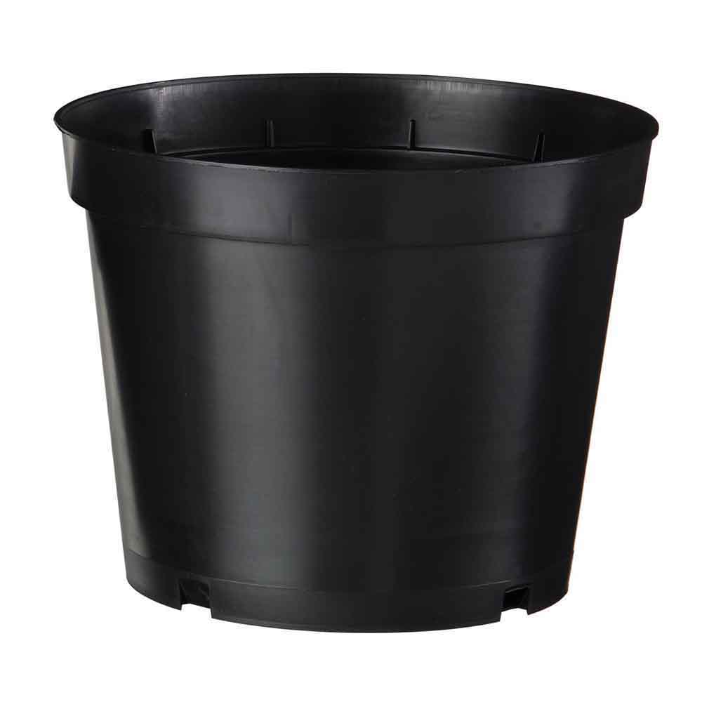 Conteneur en polypropylène de couleur noire. Fond plat avec trous de drainage en contact avec le sol et crevées latérales intérieures.