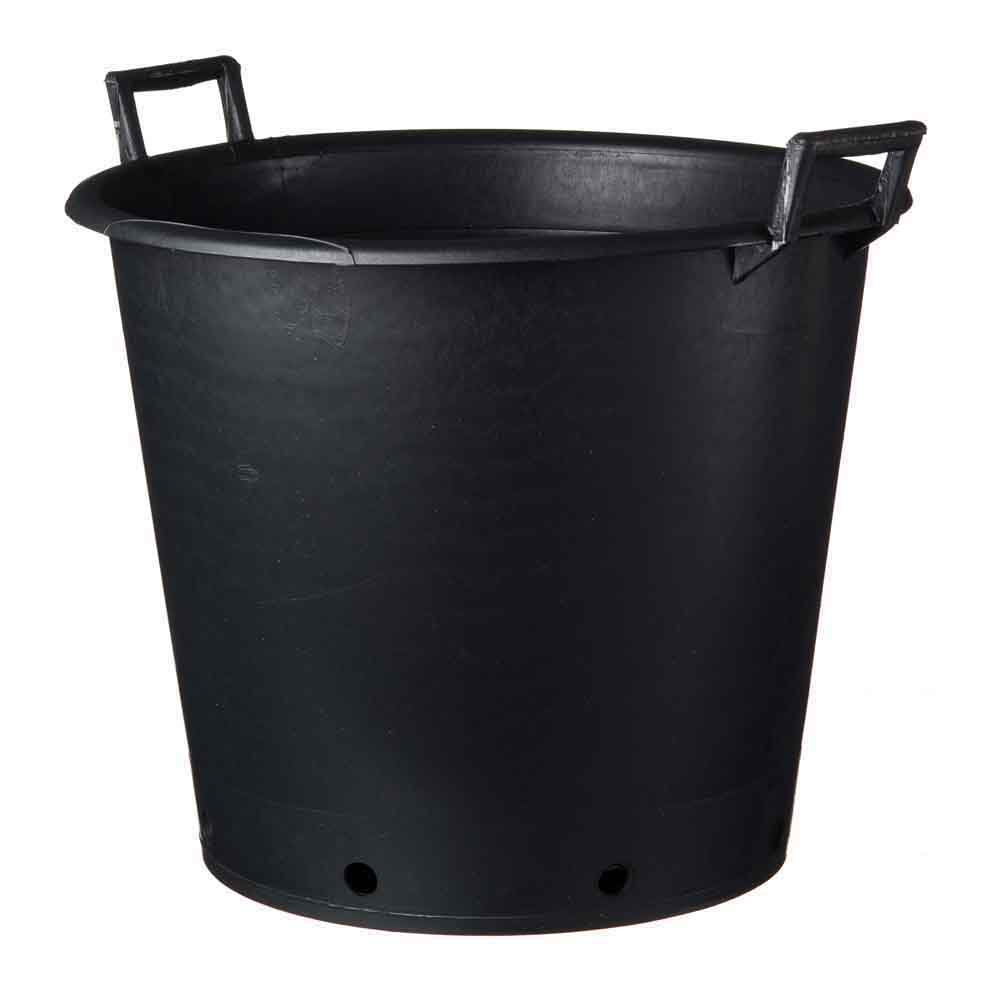 Conteneur en polyéthylène de couleur noire. Fond plat avec trous de drainage et poignées pour un transport aisé.