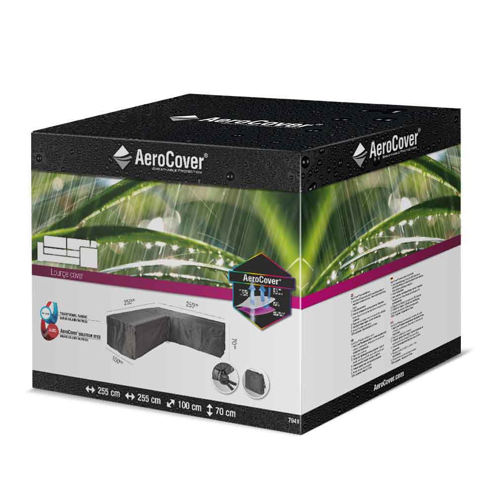 Housse de salon en coin AeroCover. Housse de salon respirante pour salon en forme de L 270x270x100xH70 avec un angle de 90°. Les AeroCovers sont respirants, résistants à l'eau, réduisent la condensation et empêchent la formation de moisissures. Le tissu est a base de fibres teintées dans la masse. Une housse AeroCover prolonge la durée de vie de votre mobilier de jardin. Les AeroCovers sont fabriqués en polyester ripstop solide et léger. Ils sont faciles à manipuler et prennent peu de place lorsqu'ils ne sont pas utilisés. La housse a un cordon de serrage pour un bon ajustement. Comprend un sac de rangement pratique. Les tissus AeroCover sont 100% imperméables.