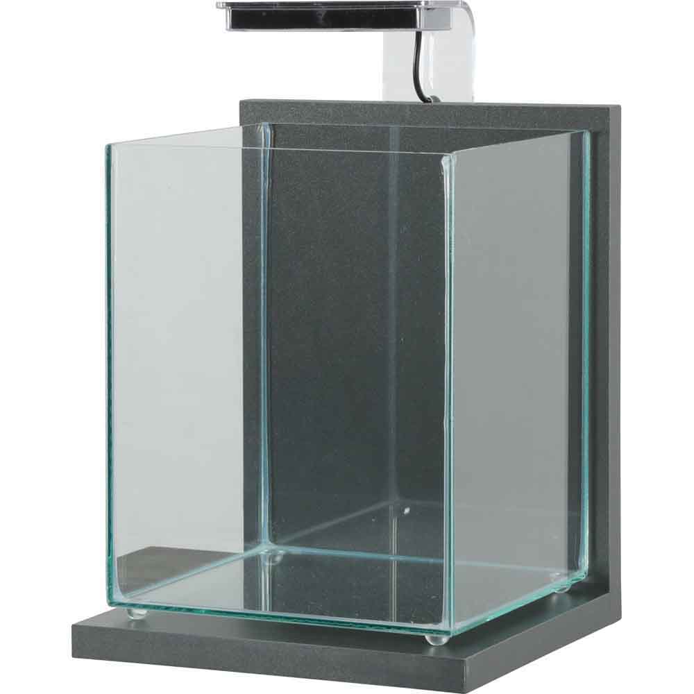 Aquarium modèle Gris anthracite issu de la nouvelle gamme JALAYA 2. Il doté d'un support en bois, d'un éclairage LED tactile 3 positions (jour/nuit/off), de 4 plots en silicone pour la cuve, d'une cuve en verre et d'un filtre cascade 30 (170L/H).
