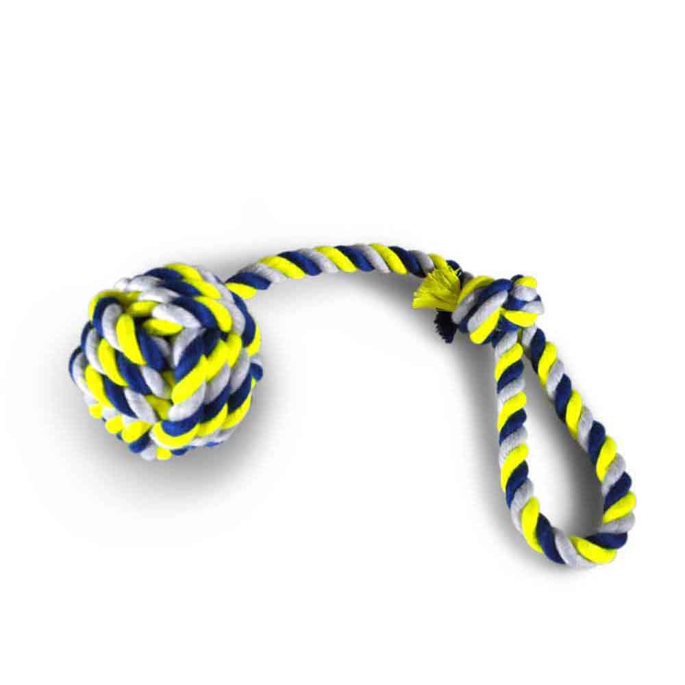 Corde coton+poignée+balle Ø10,5cm bleu-jaune 54cm