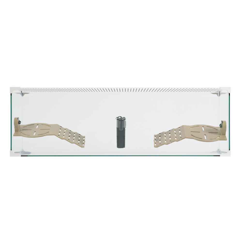 Nouvel habitat conçus spécifiquement pour les tortues d'eau. Différentes tailles sont disponibles pour s'adapter aux tailles des animaux, le choix idéal étant d'offrir une longueur 8 à 10 fois supérieure à celle du plastron de la tortue. Le modèle Karapas 100 est idéal pour une tortue jusqu'à 15 cm ou deux tortues de 10 cm, il est équipé d'une grille avec système de vérouillage : positionnée sur le haut du terrarium, la grille constitue une sécurité tant pour le risque d'évasion que pour les intrusions extérieures (chats, enfants...) ou des chutes d'objet. Quatre corners de verouillage sont fournis et à positionner dans chacuns des angles, empêchant le retrait involontaire de la grille. Un filtre intérieur puissant et réglable de 200 à 450L/h qui permet de maintenir une eau propre, les tortues produisant de nombreux déchets. Comprends également deux plateformes à fixation par ventouse, les tortues d'eau ont besoin de sortir de l'eau de temps en temps. Les plateformes fournis se positionnent selon l'envie à l'aide d'une ventouse puissante qui les maintiennent parfaitement. Dimensions totales Karapas 100 avec les cornières d'angle : L 100,5 x p 40,5 x h 30,5 cm. Dimensions cuve sans les cornières d'angle : L 100 x p 40 x h 30 cm. Volume utile : environ 69 litres. Epaisseur du verre : 6 mm. Coloris : Blanc