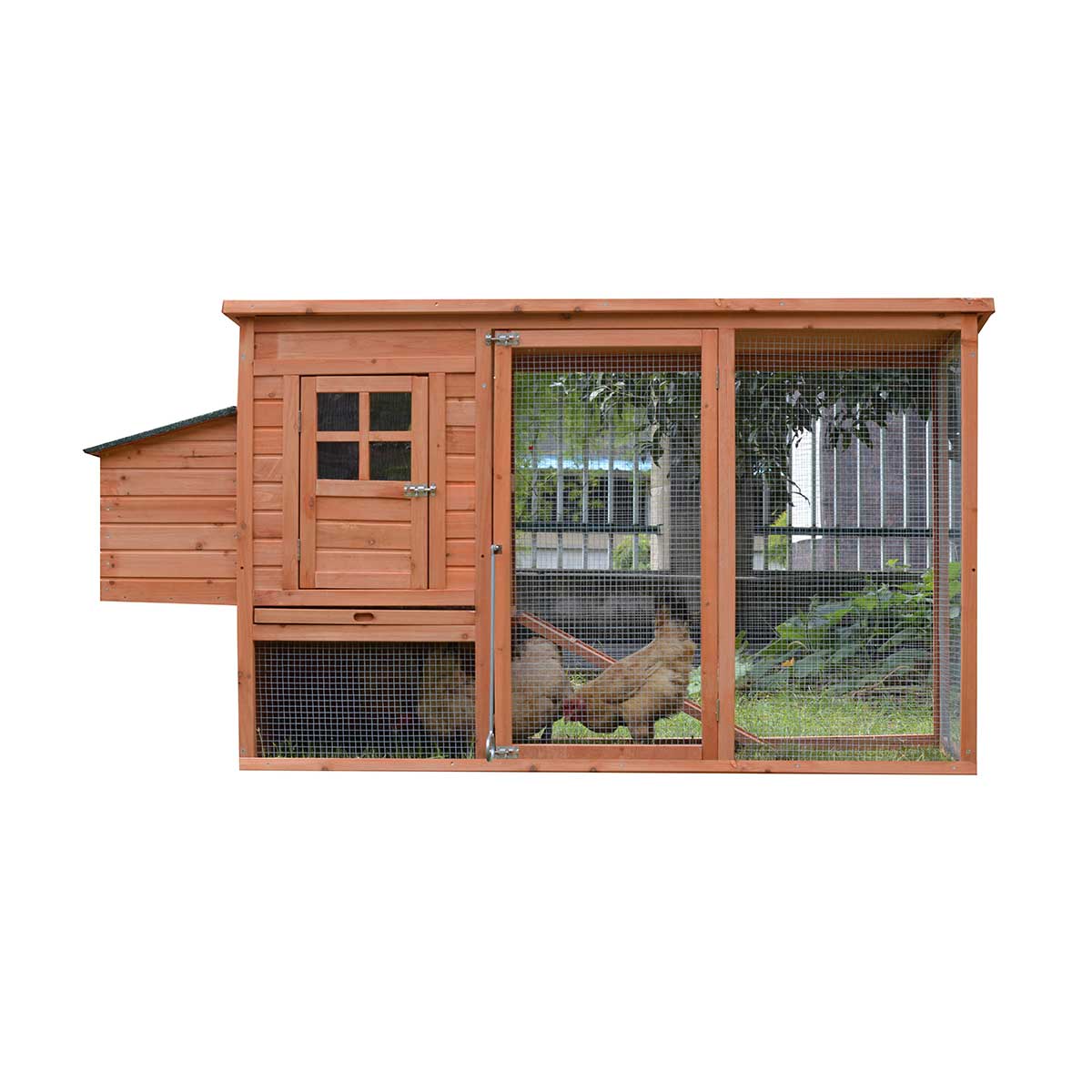 Poulailler bois + parcours couvert, convient pour maximum 4 poules si pas de parcours extérieur et pour maximum 8 poules avec parcours supplémentaire. Sécurité maximale contre les renards et les fouines la nuit si vous mettez un grillage dessous. Le plus du modèle, la journée vous lâchez les poules dans le parcours extérieur et la nuit vous les rentrez dans le parcours intérieur. Pendant vos vacances, vous laissez les poules en sécurité dans le parcours intérieur. Fini la corvée de demander au voisin de venir ouvrir le matin et fermer le soir, il suffit alors que quelqu'un passe tous les 2-3 jours pour mettre à boire et à manger. Il possède évidemment un tiroir pour faciliter le nettoyage et 2 pondoirs.