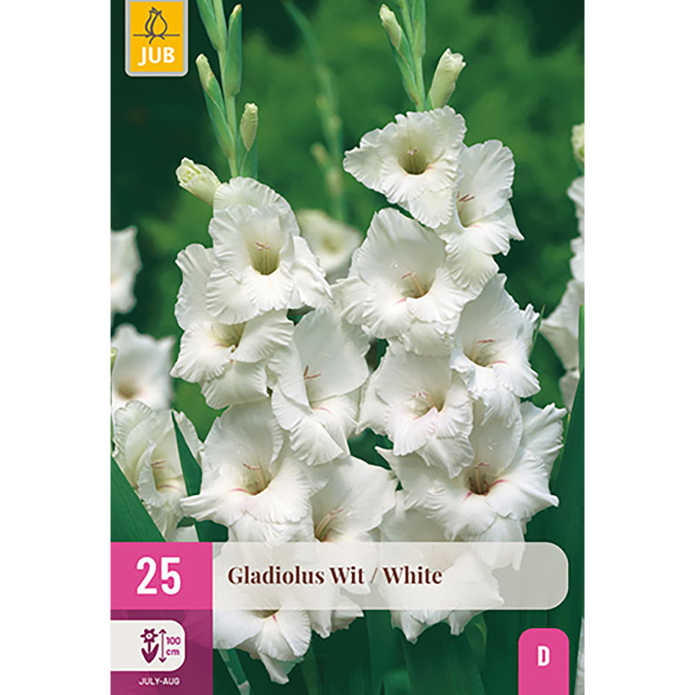 Glaïeul 'White'. Les glaïeuls sont de véritables fleurs d'été qui peuvent fleurir jusqu'à l'automne. Ce glaïeul à grandes fleurs et richement fleuri atteint 100 cm et est également une belle fleur coupée. Assurez-vous donc de planter une rangée de glaïeuls dans la partie de votre jardin réservée aux fleurs coupées. De plus, les glaïeuls sont très florifères et ne devraient donc pas manquer dans votre jardin fleuri d'été.