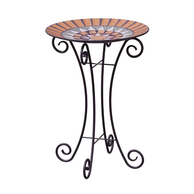 Bassin d'eau sur pieds pour les oiseaux. Décor de mosaïque italienne. Diamètre 46 cm. Admirez les oiseaux qui viennent se désaltérer et se laver.