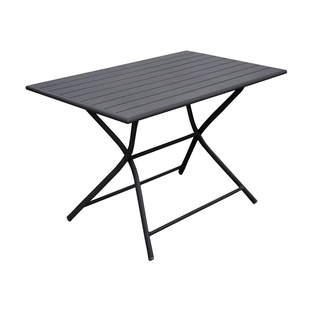 Guéridon GLOBE pliant 110x70 graphite. Le piétement pliant du guéridon Globe permet une mise en place et un rangement optimisés ! A vous les joies d'un petit déjeuner en terrasse, d’un diner en tête à tête confortablement installé sur votre balcon ou dans votre jardin. Pratique et pliant, ce guéridon se déplace et se range facilement. Le guéridon Globe est fabriqué sur une structure à 100% en aluminium, qui lui confère une grande légèreté et résistance, si bien qu’il peut même être utilisé dans les zones proches de la mer. Table carrée, plateau à lattes, piétement pliant, peinture époxy. Pour 2 à 4 personnes. Prêt à monter. Fabrication Chine, garantie 2 ans. L/H/P (cm) : 110 x 74 x 70