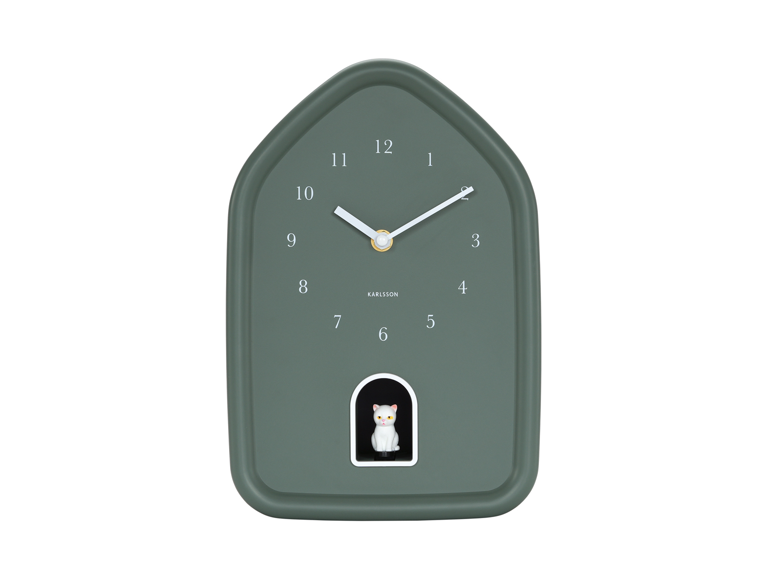 L'horloge murale Modern Kitty de Karlsson allie simplicité et touche ludique. Toutes les heures, un adorable chaton apparaît en miaulant doucement. Son design en forme de maison et ses couleurs mates lui confèrent un style chaleureux et moderne. Parfaite pour les amoureux des chats et les amateurs de designs élégants et ludiques. Couleur Vert jungle