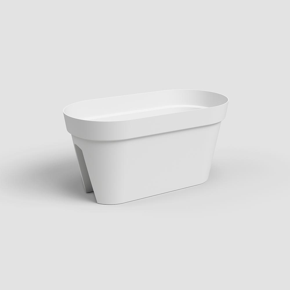 Floreira de plástico reciclado para varanda, fabricada em polipropileno, leve, durável, reciclável e reutilizável. Inclui dois fixadores ajustáveis e furos de drenagem. Com proteção UV e à prova de gelo. Indicado para varandas com largura máxima de 6,5cm. Produzido em Portugal.