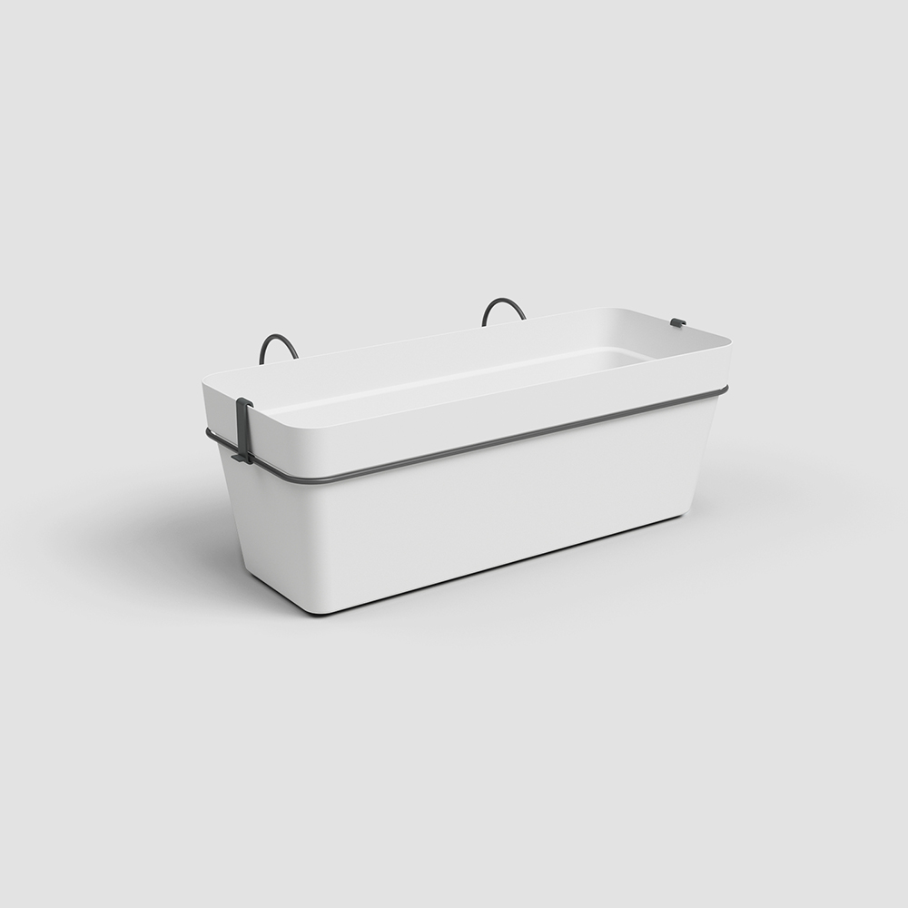 Kit de jardinière en plastique recyclé pour balcon, fabriqué en polypropylène, léger, durable, recyclable et réutilisable. Comprend un trou de drainage avec bouchon, une pièce de stabilisation et un bac de réserve d'eau. Avec protection UV et résistant au gel. Convient aux balcons. Fabriqué au Portugal