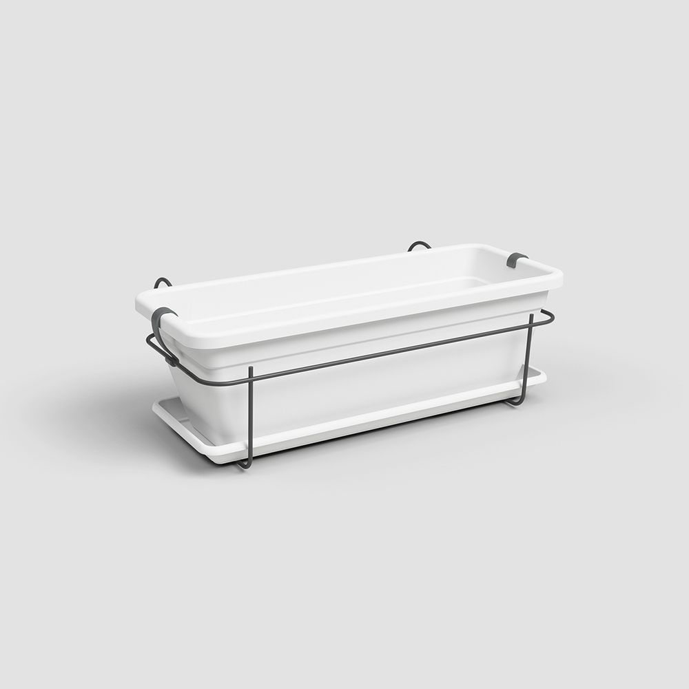 Kit de jardinière en plastique recyclé pour balcon, fabriqué en polypropylène, léger, durable, recyclable et réutilisable. Comprend des trous de drainage, une pièce de stabilisation en fer, un plateau et des clips de fixation. Jardinière avec protection UV et résistante au gel. Convient aux balcons. Fabriqué au Portugal.