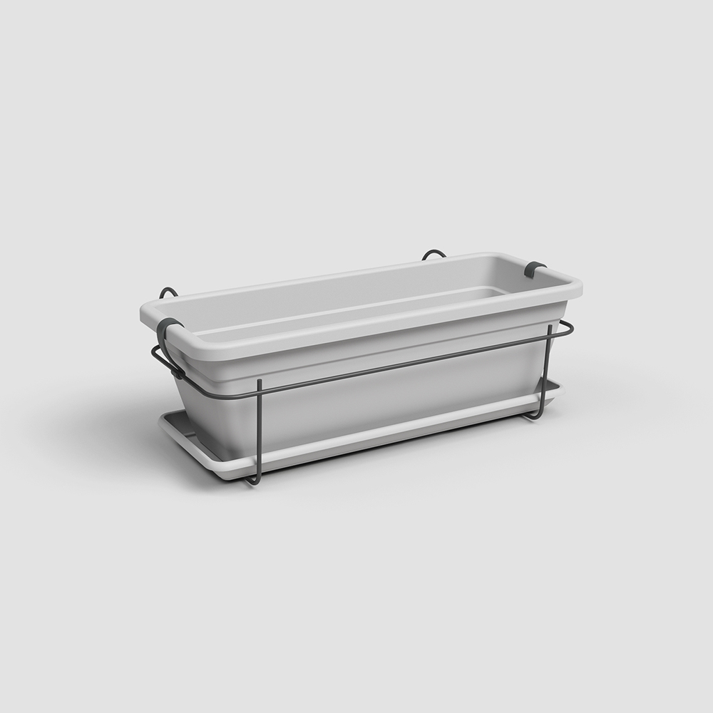 Kit de jardinière en plastique recyclé pour balcon, fabriqué en polypropylène, léger, durable, recyclable et réutilisable. Comprend des trous de drainage, une pièce de stabilisation en fer, un plateau et des clips de fixation. Jardinière avec protection UV et résistante au gel. Convient aux balcons. Fabriqué au Portugal.