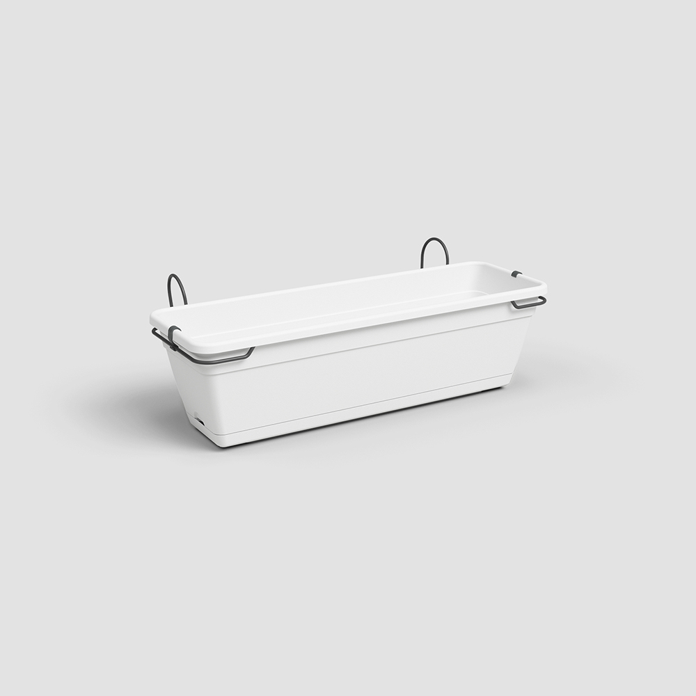 Kit de jardinière en plastique recyclé pour balcon, fabriqué en polypropylène, léger, durable, recyclable et réutilisable. Comprend des trous de drainage, une pièce de stabilisation en fer, un soucoupe et des clips de fixation. Jardinière avec protection UV et résistante au gel. Convient aux balcons. Fabriqué au Portugal.