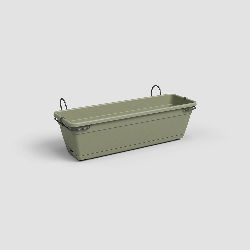 Kit de jardinière en plastique recyclé pour balcon, fabriqué en polypropylène, léger, durable, recyclable et réutilisable. Comprend des trous de drainage, une pièce de stabilisation en fer, un soucoupe et des clips de fixation. Jardinière avec protection UV et résistante au gel. Convient aux balcons. Fabriqué au Portugal.