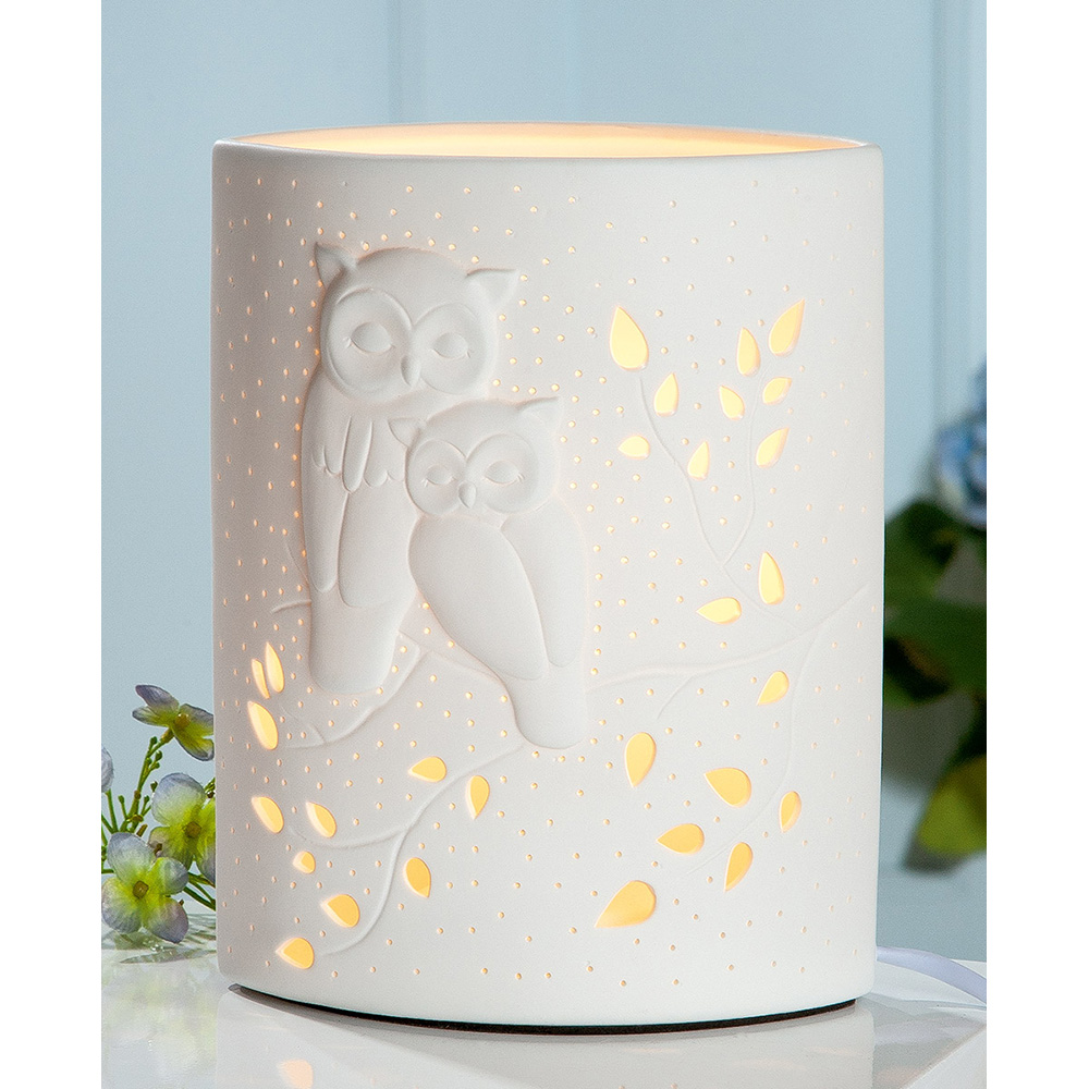 Lampe de table Gilde, motif hibou, porcelaine blanche, L. 10 cm, l. 18 cm, H. 28 cm