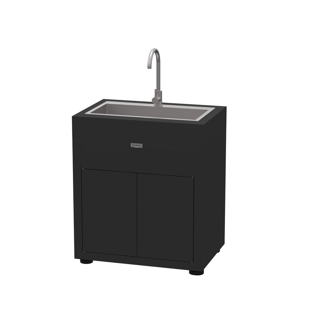 1 meuble avec évier intégré 80*55 cm. Evier inox encastré avec mitigeur col de cygne. En version acier peinture époxy coloris noir. Portes avec système d’ouverture « push-pull » (une simple pression déclenche l’ouverture de la porte). Certification Origine France Garantie. Dimensions : 80 x 55 x 128cm. Poids : 40kg.