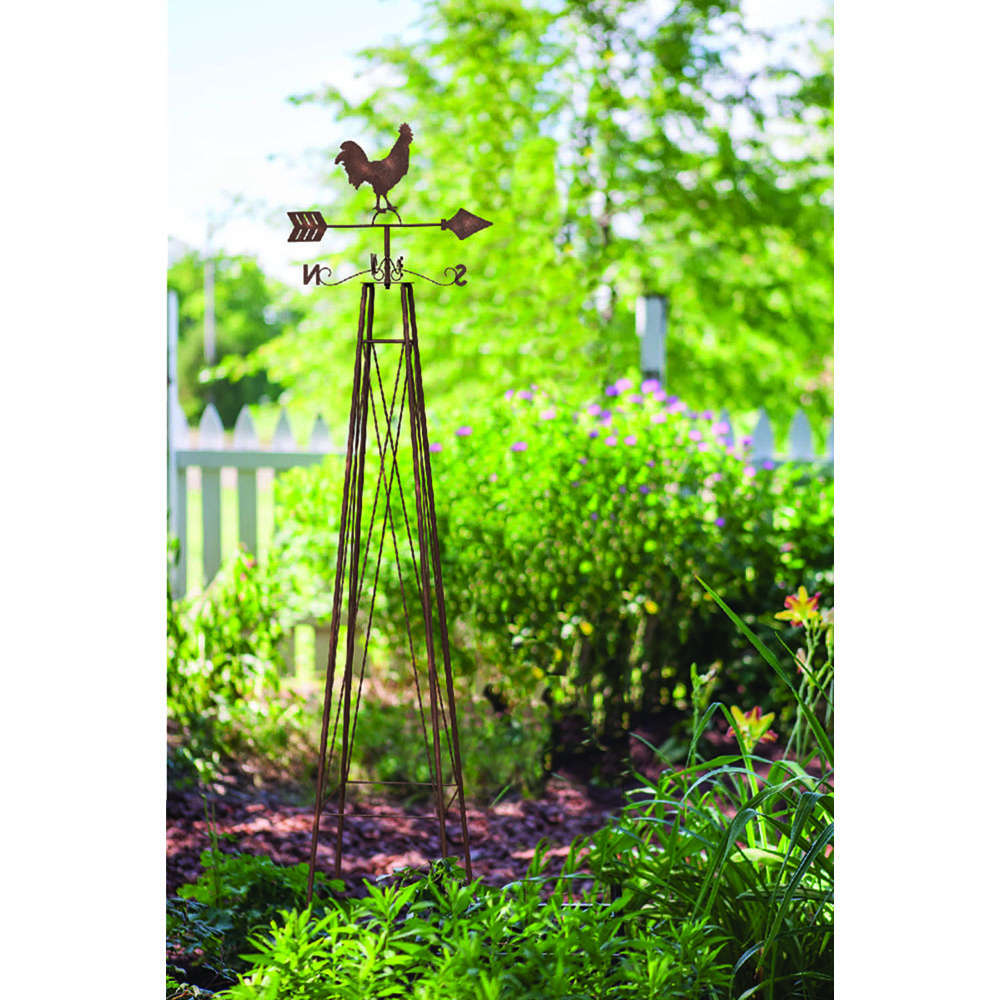 Obélisque couleur rouille avec girouette de coq au sommet. Hauteur 182 cm.