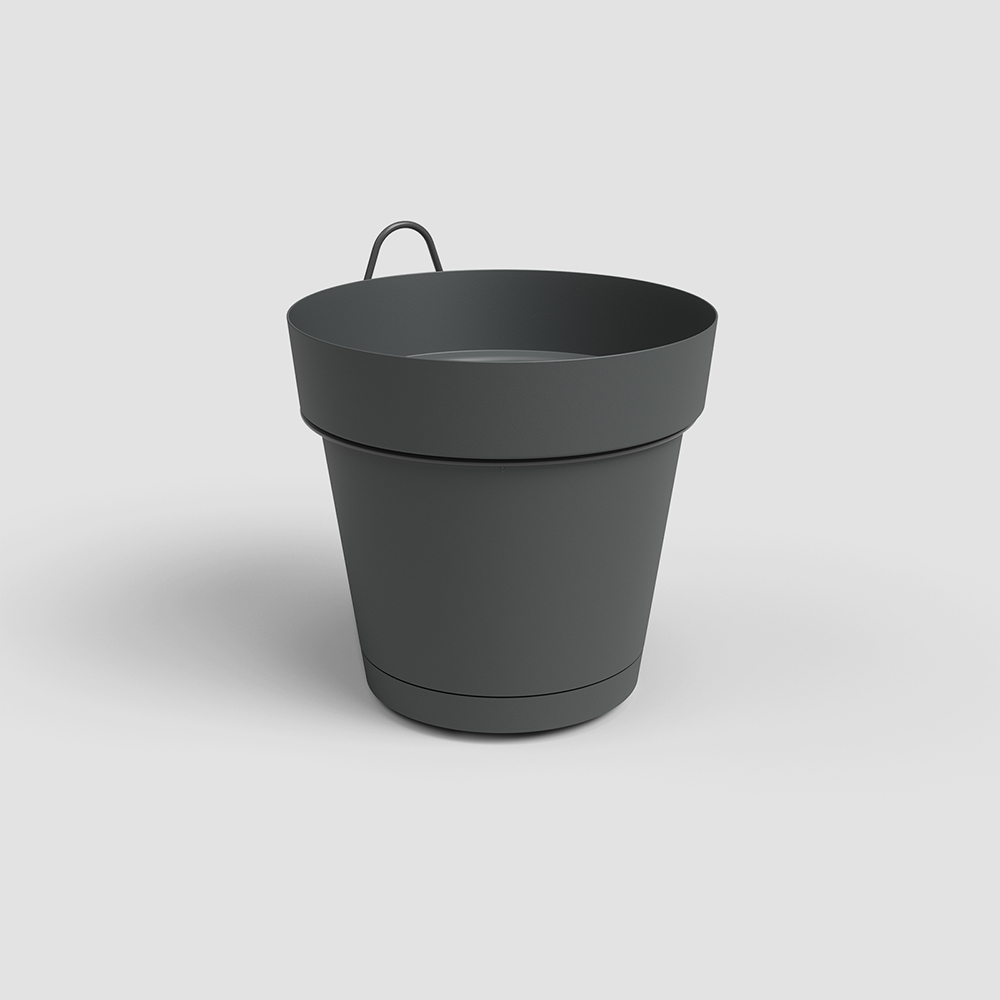 Kit de pot en plastique recyclé pour mur, fabriqué en polypropylène, léger, durable, recyclable et réutilisable, avec protection UV, résistant au gel et doté de trous de drainage. Comprend un support en fer pour fixation murale. Convient pour les espaces extérieurs et intérieurs. Fabriqué au Portugal.