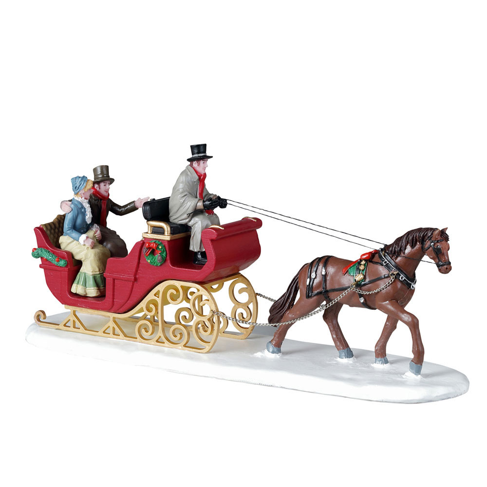 Tiré par une majestueuse baie de Cleveland, ce traîneau rouge navigue à travers la campagne pour un voyage magique. Chauds et confortables à l’arrière, les deux passagers sont occupés à admirer la vue tandis que le conducteur de traîneau chevronné guide habilement son cheval et son traîneau dans la neige pour montrer la beauté du village et des rivières, forêts et montagnes environnantes.