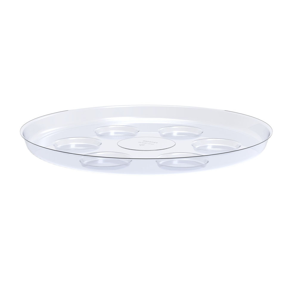 Soucoupe transparente avec pochettes réserve d'eau, pieds surélevés et bord renforcé. Diamètre 40,6 cm