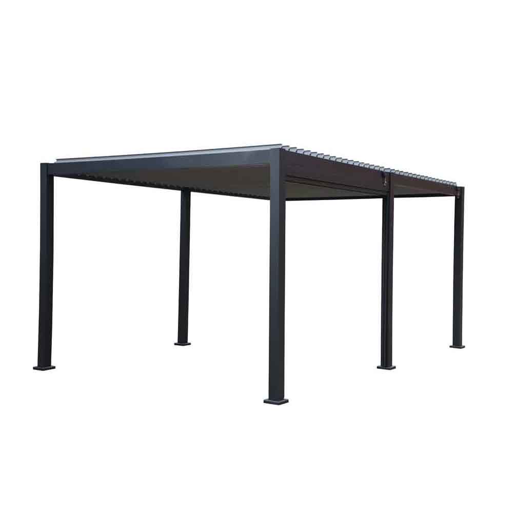 Tonnelle bioclimatique lames orientables de 16x2,7 cm - structure aluminium, ouverture à 100° par manivelle. LEDS intégrées 3 niveaux d’intensité Autoportée et murale. Télécommande incluse. Store en option 527 x 349 x 250 Anthracite / Gris clair