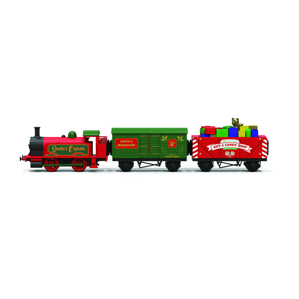 Le train du Père Noël est un coffret complet à l’échelle 1:76 du spécialiste du modélisme ferroviaire Hornby. Le train fonctionne avec une batterie rechargeable. Un câble de charge USB-C est inclus. Le train est équipé de lumières et d’effets sonores (bruit de locomotive à vapeur, sifflet, cloche, Santa ho ho ho). Il se commande via un bouton situé sur la locomotive. Le circuit de rails forme un rond de 77 x 77 cm.
