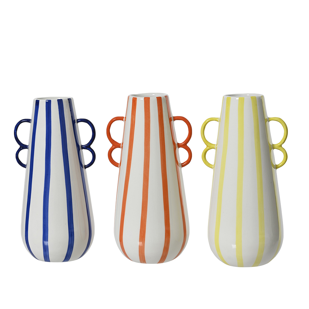 Apportez des couleurs vibrantes et un artisanat artistique avec ce vase Decoris. Chaque pièce faite à la main présente un design élancé et effilé, orné de rayures saisissantes en bleu, orange ou jaune. Les vases en porcelaine allient une forme moderne à des doubles poignées ludiques, faisant d’eux un ajout élégant à tout intérieur. Placez-les avec des fleurs fraîches sur une table ou en décoration pour donner instantanément plus de caractère à votre espace.