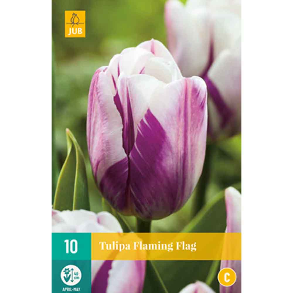 Tulipe flammée violet-blanc. Agréable à combiner avec les jonquilles blanches, les jacinthes et Muscari armeniacum. Tulipe de jardin remarquable, mais convient également pour un pot sur un patio ou un balcon.