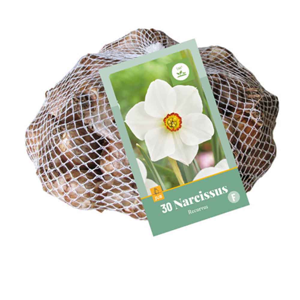 Le beau Narcissus recurvus subtil a des pétales blancs et une très petite couronne jaune avec un bord orange. Ce narcisse est le meilleur parmi les plantes vivaces. Ils ont également l'air bien dans l'herbe. Gardez à l'esprit que cette partie ne peut être tondue que plus tard. Recurvus peut également être planté en pot pour le patio ou le balcon. Très approprié pour la naturalisation. Parfumé.