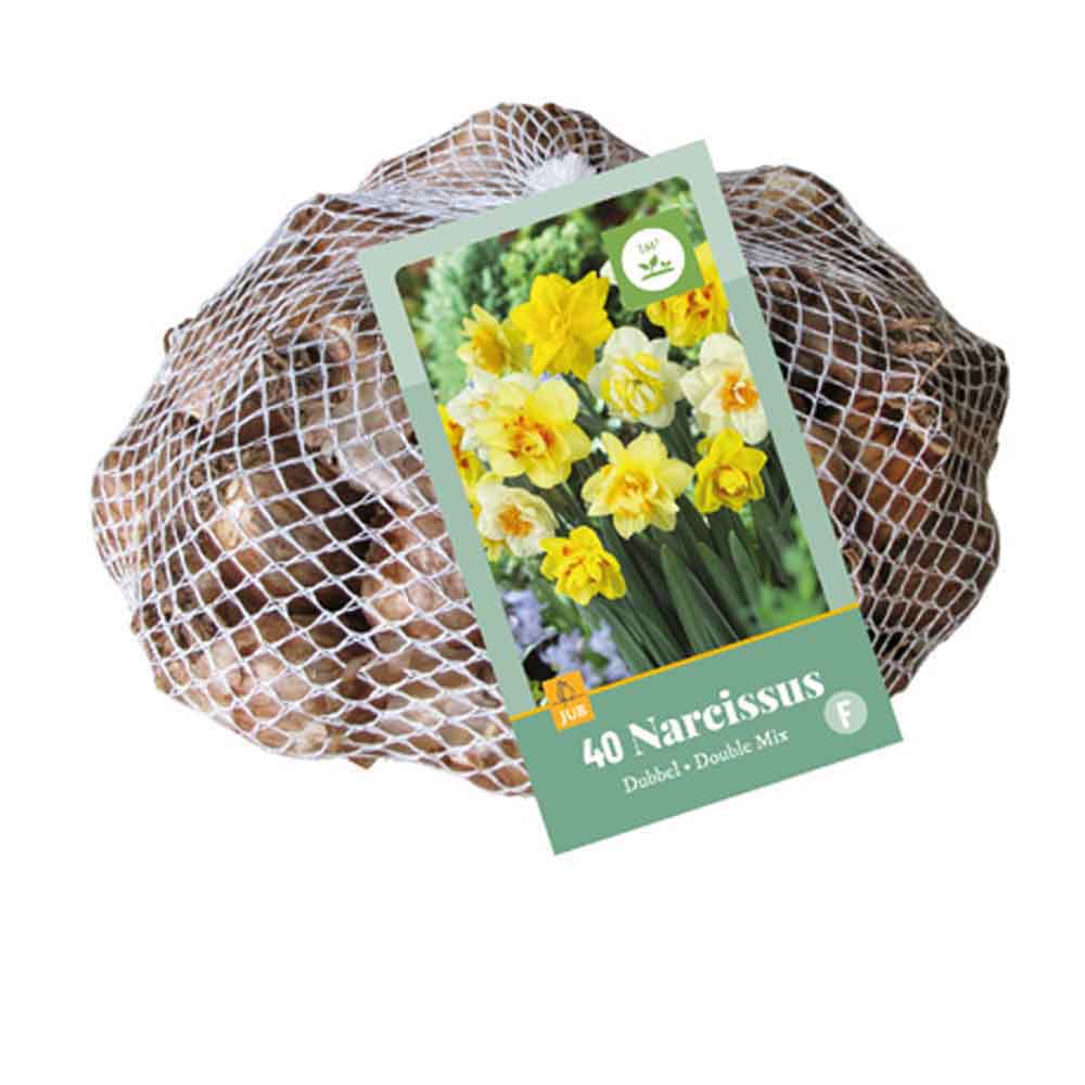 Un emballage en netlon avec un mélange de 40 jonquilles doubles avec étiquette photo avec instructions de plantation.