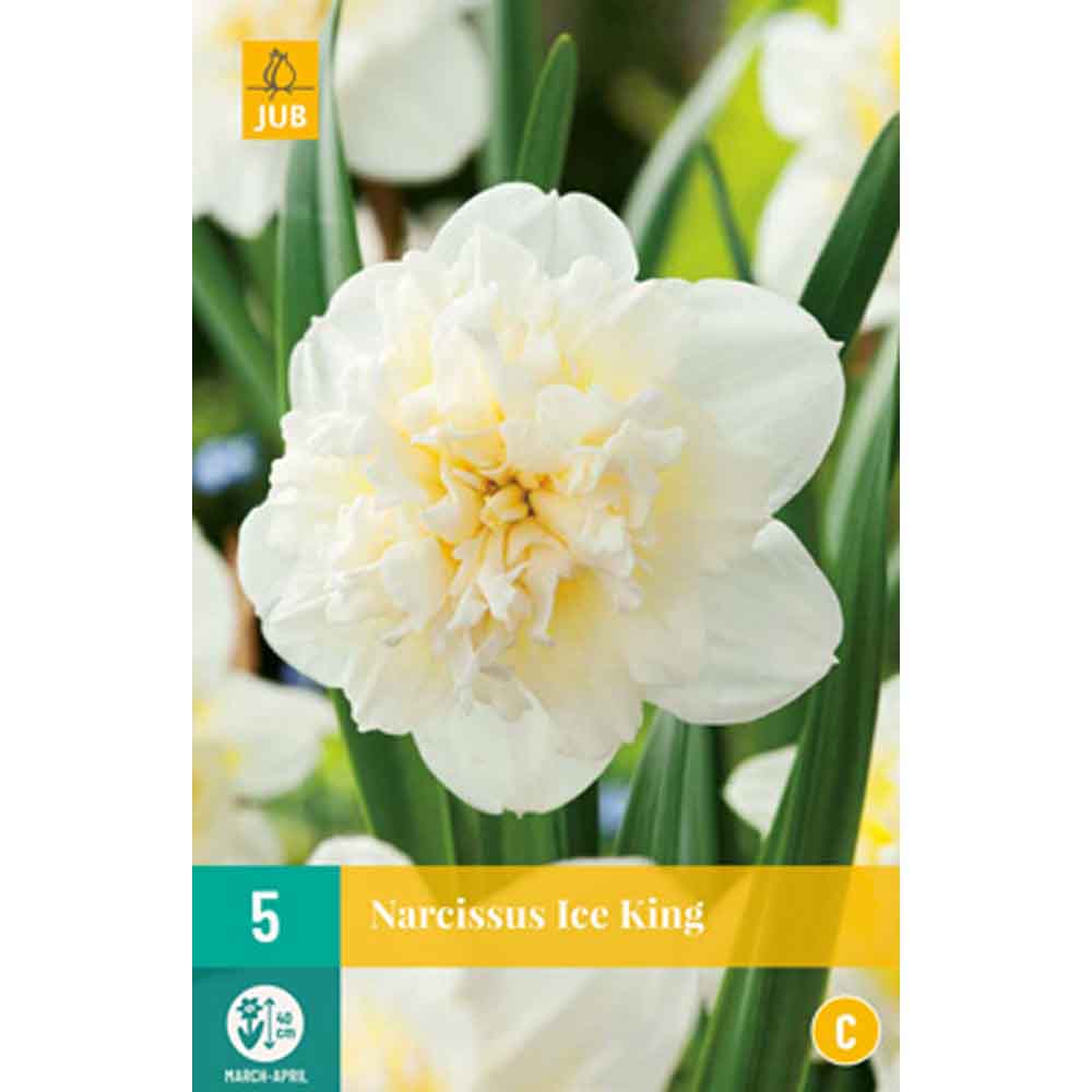 Ice King est un magnifique Narcisse à fleurs doubles. La fleur est jaune tendre avec du blanc. C'est un narcisse très approprié pour la naturalisation. Ice King est un accroche-regard dans la bordure, mais aussi beau dans des pots sur le patio ou le balcon. Agréable à combiner avec Muscari, jacinthes et tulipes.